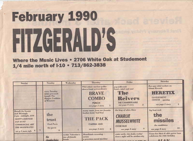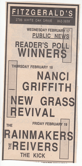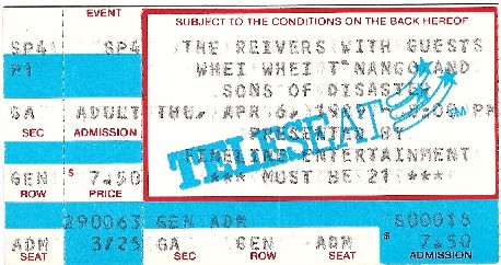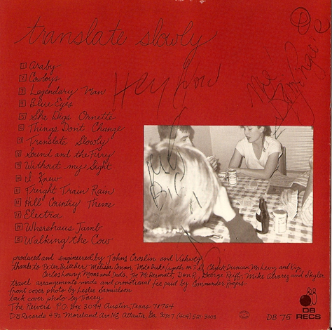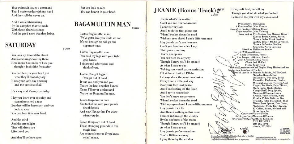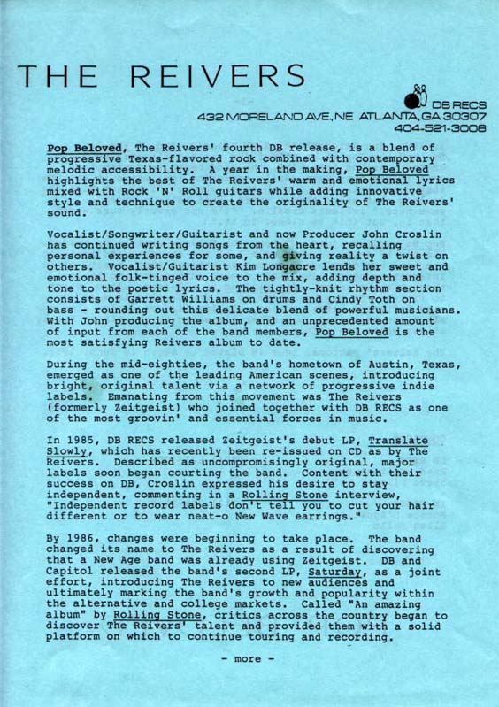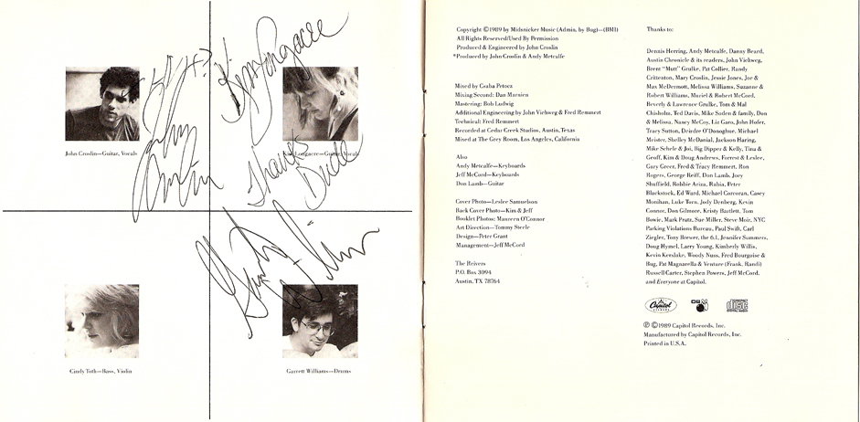 Button – 1980’s or 1990’sButton – Reunion shows 2008The “Ragamuffin Rag”, prepared by Peter Blackstock, future editor of No Depression music magazine. There was only this one issue and an update, which was prepared by Jeff McCord, Reivers’ manager.The “Ragamuffin Rag”, prepared by Peter Blackstock, future editor of No Depression music magazine. There was only this one issue and an update, which was prepared by Jeff McCord, Reivers’ manager.The “Ragamuffin Rag Update” was prepared by Jeff McCord, the Reiver’s manager at the time. This was an update to the newsletter.Letter to a fan from Kim Longacre, 1989A handmade-by-the-band postcard announcing the release of Pop BelovedA handmade-by-the-band postcard announcing the release of Pop BelovedA handmade-by-the-band postcard announcing the release of Pop BelovedA bio of the Reivers was included with vinyl versions of Pop Beloved.A bio of the Reivers was included with vinyl versions of Pop Beloved.Beer setlist, front & back, date unknownSetlist with “creative” song titles, date unknownSetlist with “creative” song titles, date unknownTicket, Aug. 23, 1986Ticket, Jan. 28, 1988Ticket, Sep. 16, 1988Ticket, April 6, 1989Ticket, 2008 reunion showSigned ticket (front), 2008 reunion showSigned ticket (back), 2008 reunion showNewspaper Ad, The Houstonian- Sam Houston State University Homecoming, Houston, TX 1986 Newspaper Ad, The Houstonian- Sam Houston State University Homecoming, Houston, TX 1986Ad for show at Fitzgerald’s, Houston TX Feb. 19, 1988 Ad for show at Fitzgerald’s, Houston TX April 30, 1988Ad for show at Fitgerald’s, Houston TX Feb. 2, 1990Signed Saturday, courtesy of Mike Sandefur Signed Saturday (detail of Kim’s signature: “Not Me, ‘Kay (not Cindy, John or Garrett either- Love, Kim”)), courtesy of Mike SandefurSigned End of the Day, courtesy of Mike SandefurSigned Saturday booklet, courtesy Grayson AmickSigned Saturday booklet, courtesy Grayson AmickSigned Saturday booklet, courtesy Grayson AmickSigned End of the Day booklet, courtesy Grayson Amick Signed Translate Slowly booklet, courtesy Grayson AmickSigned Translate Slowly booklet, courtesy Grayson Amick