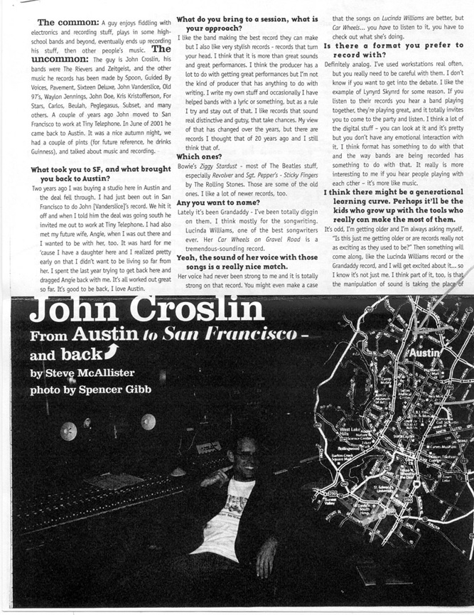 John Croslin: From Austin to San Francisco and Back, by Steve McAllister. Tape Op, Nov./Dec. 2002.