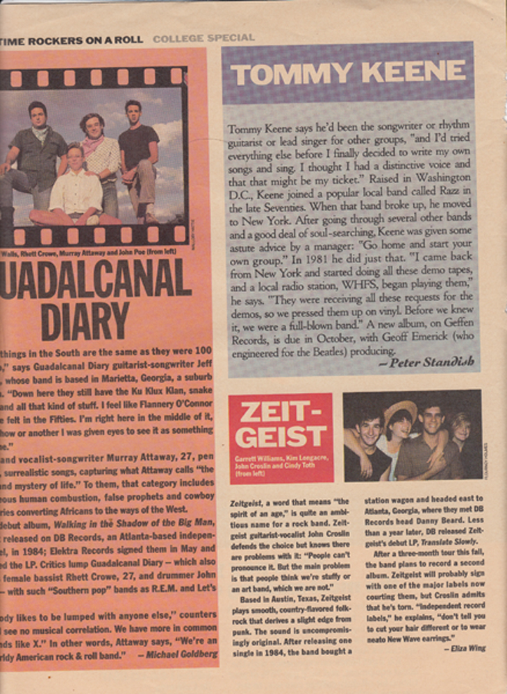 Excerpt from “Small-time rockers on a roll (new rock groups).” by Michael Goldberg, Eliza Wing and Peter Standish. Rolling Stone, Sept. 26, 1985(4).