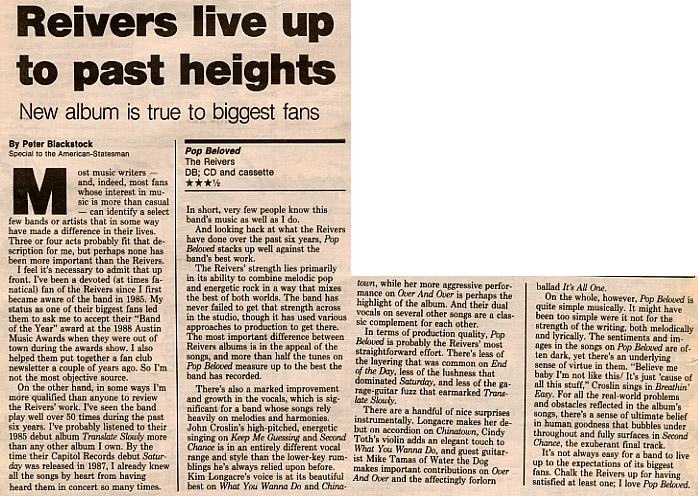Review – “Pop Beloved”: Reivers live up to past heights: New album is true to biggest fans. By Peter Blackstock. Austin American- Statesman, April 18, 1991, p19(1).